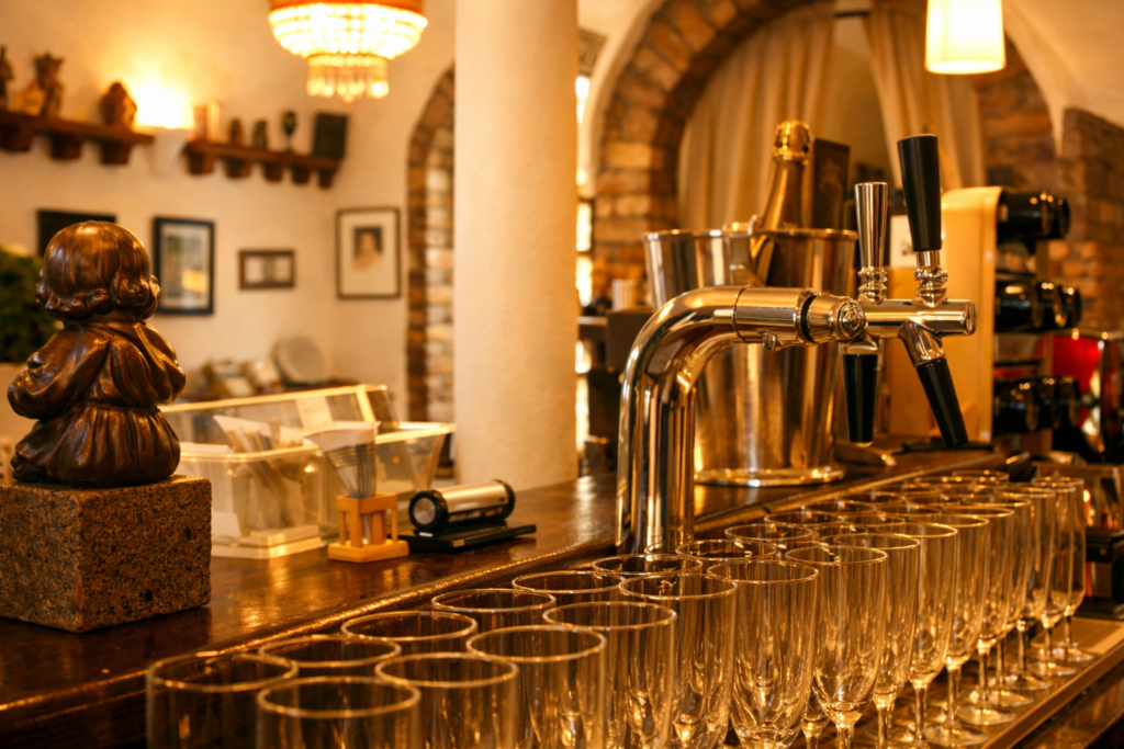 Die entspannte Atmosphäre lädt dazu ein, mit Freunden zusammenzusitzen und den Moment zu genießen. Ein schöner Ort für einen Drink nach der Arbeit oder einen gemütlichen Start in den Abend.